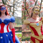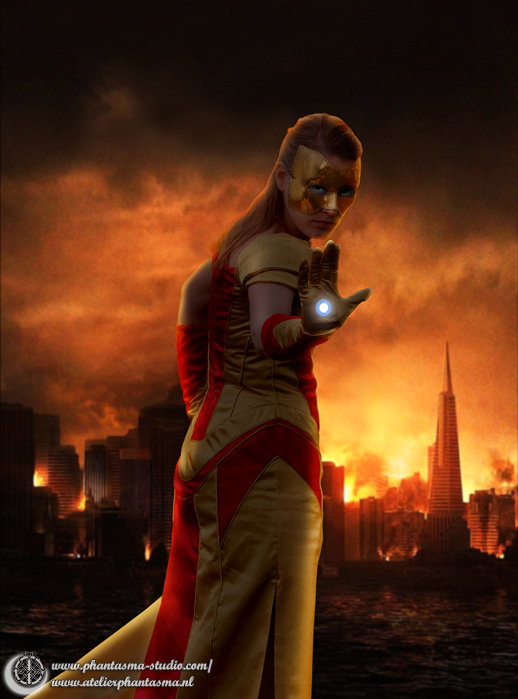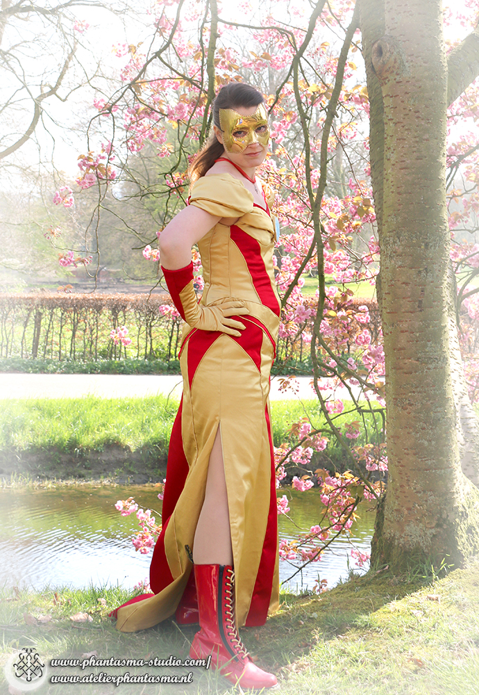 Een split in de jurk toont stoere biker boots, de handschoenen representeren de gewapende handen van het harnas en het masker de gesloten helm met gezichtsvorm, die zo kenmerkend is voor de Iron Man suits.