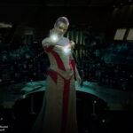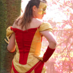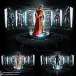 De Mark 42 jurk is gebaseerd op zijn 42e ‘Iron Man suit’, één die de hoofdrol speelt in Iron Man III. Op speelse wijze hebben we geprobeerd de satijnen jurk door het gebruik van dezelfde kleuren en vlakverdeling hierop te laten lijken. Het lijnenwerk, dat benadrukt wordt door piping, is een knipoog naar dat op het harnas, dat de mannelijke vorm naar voren brengt; hier onderstreept het juist de vrouwelijke vorm. Borst en schouders zijn bedekt met gevouwen stof, wat diepte geeft maar wel strak blijft. Op het midden van de borst is een cirkel genaaid die uit een sandwich bestaat van satijn, iriserende stof en kant. Deze stelt de ‘arc reactor’ voor, een sterke energiebron die Tony heeft gebouwd, op basis van nucleaire energie.